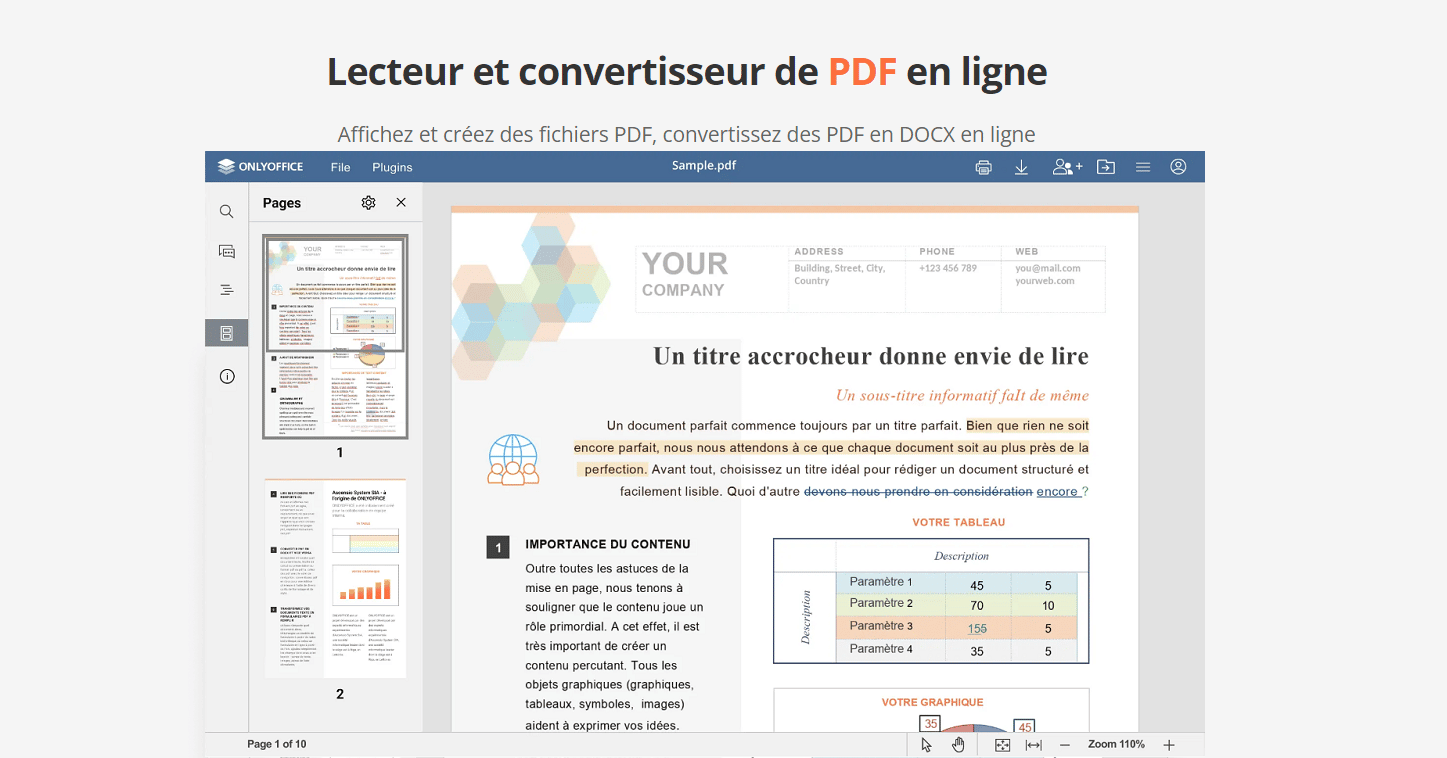 ONLYOFFICE Docs est une suite bureautique en ligne à code source ouvert, conçue pour les documents texte, les présentations, les feuilles de calcul et les formulaires à remplir. Elle est totalement compatible avec les fichiers Word, Excel et PowerPoint et supporte même les formats ODF. C’est pourquoi ONLYOFFICE Docs est une bonne solution alternative aux autres suites bureautiques bien connues, telles que Microsoft Office et Google Docs.