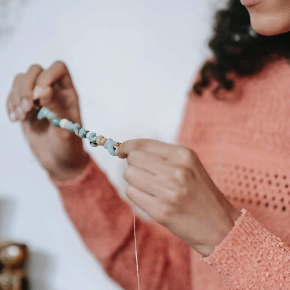 - Ajout des perles et des breloques : Enfilez les perles et les breloques de votre choix sur le cordon. Vous pouvez alterner les couleurs et les formes pour créer un motif unique. Assurez-vous de laisser suffisamment d’espace entre chaque perle pour que le collier puisse être ajusté facilement.